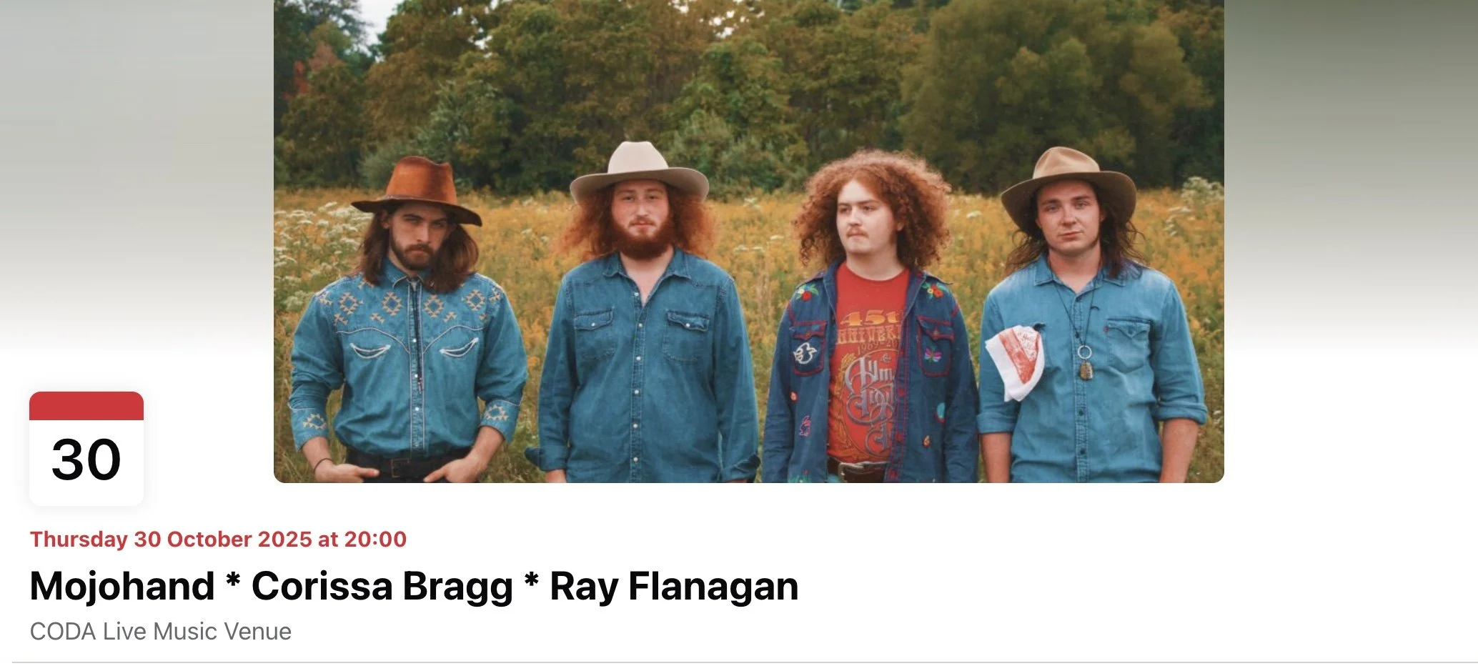 Get tickets here: https://www.eventbrite.com/e/mojohand-ray-flanagan-corissa-bragg-at-coda-tickets-1783247724949?utm-campaign=social&utm-content=attendeeshare&utm-medium=discovery&utm-term=listing&utm-source=cp&aff=ebdsshcopyurl